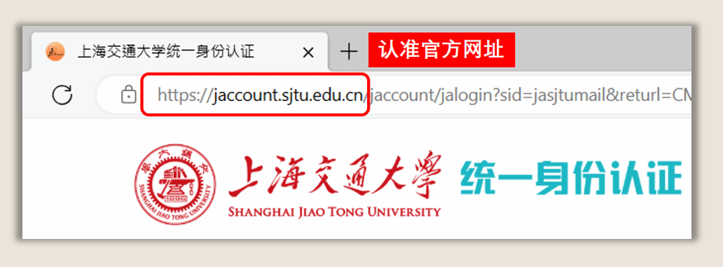 3、输入用户名密码前,确认网站域名,不要在非jAccount官方页面输入学校统一身份认证账号密码。