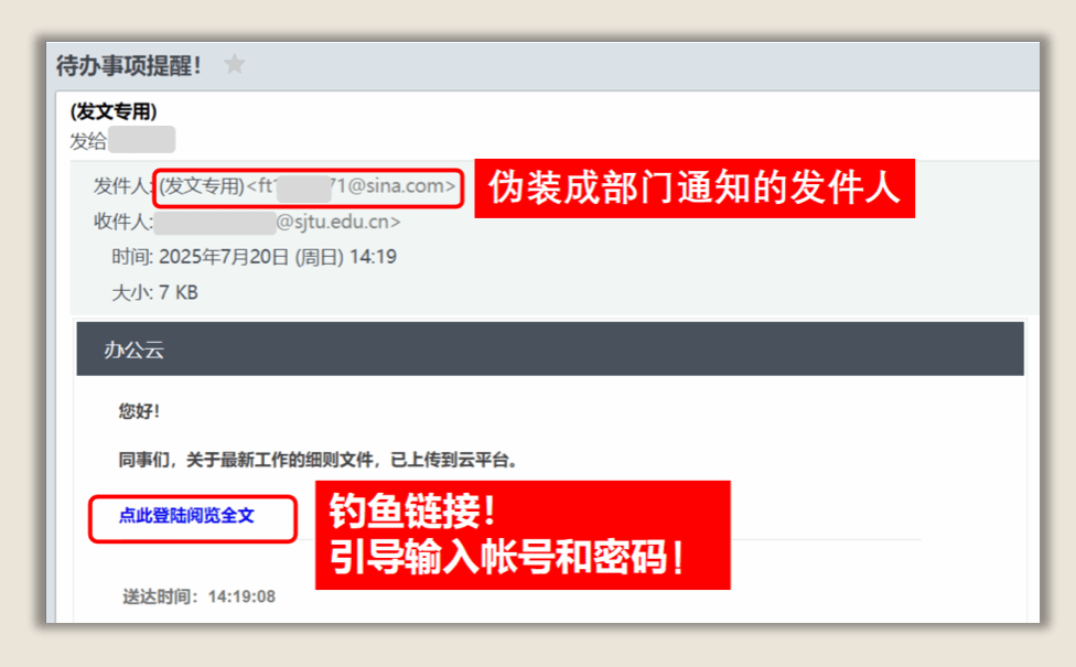 通过伪造系统升级、办公文件分享等内容,引导用户点击链接输入账号及密码。如不慎上当受骗,在钓鱼网站中输入了账号密码,您的个人信息将被泄露,您的账号还将成为向身边同学、同事继续传播钓鱼邮件的源头。