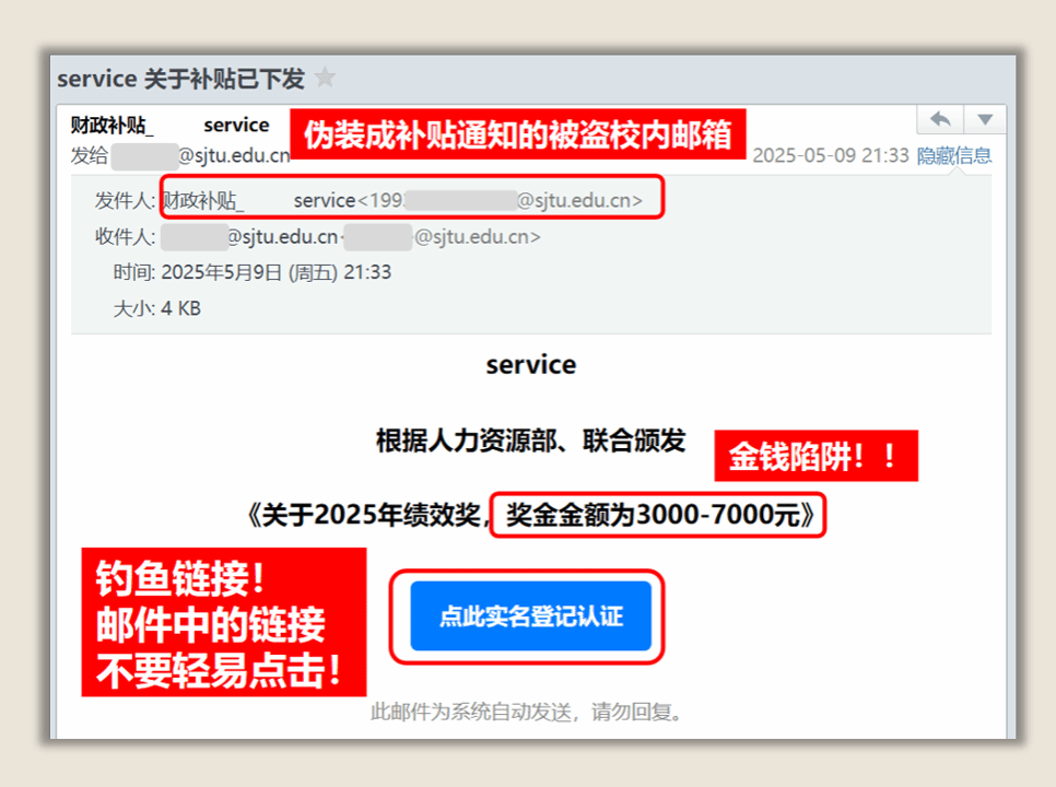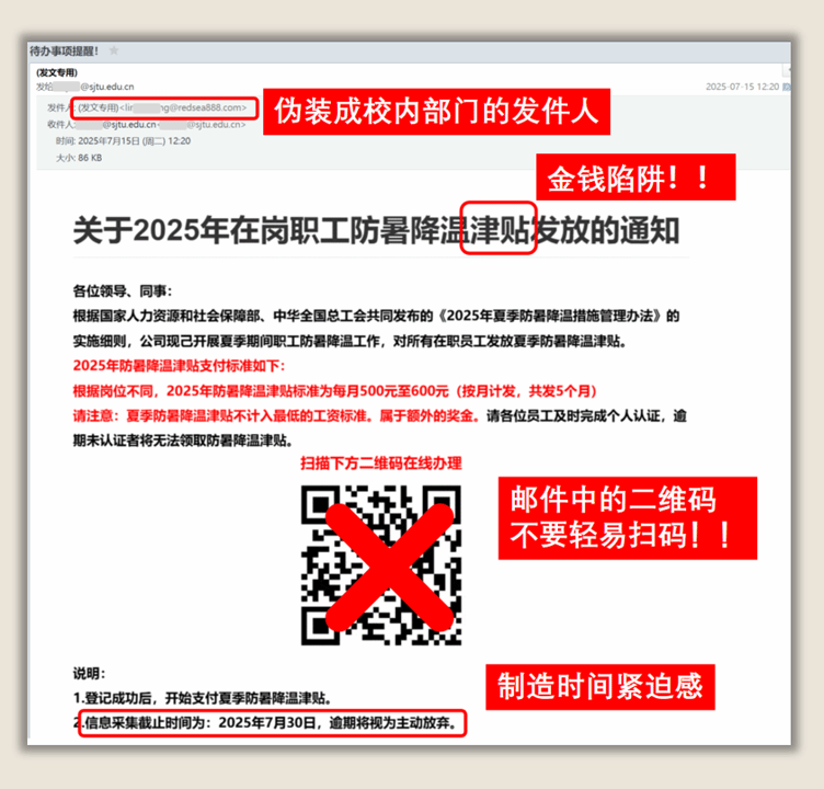 钓鱼邮件已成为校园网络安全的重要威胁。不法分子伪装成校内部门、系统管理员、办公室等,通过伪造“高温津贴发放”、“绩效奖金发放”、“系统升级”等邮件,诱导师生扫描二维码、打开恶意链接、运行带病毒木马附件等,一旦点击输入个人信息可能导致: