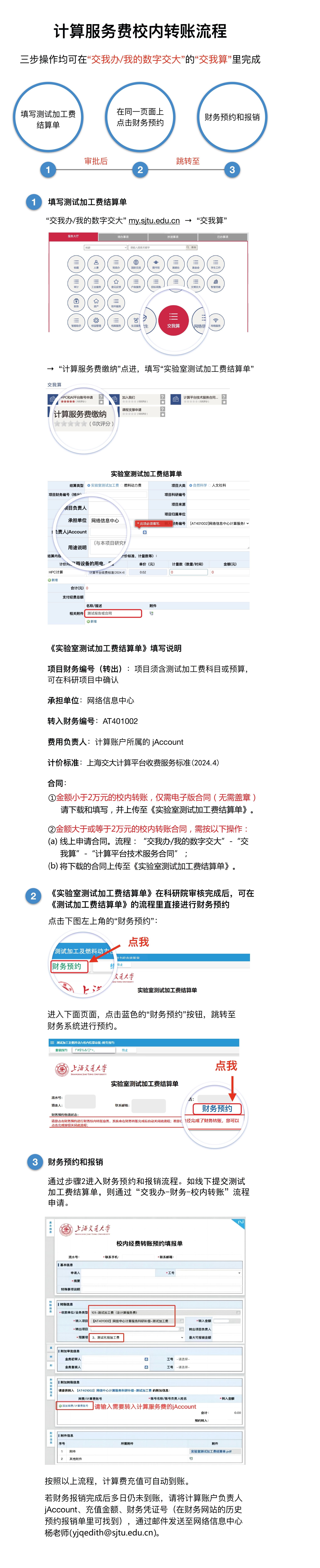 a)线上申请合同。流程:“交我办/我的数字交大”-“交我算”-“计算平台技术服务合同”;